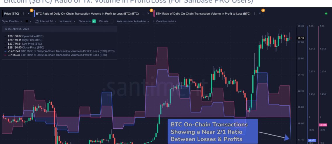 According to data from the on-chain analytics firm Santiment, traders are currently taking losses at twice the rate of profits. The relevant indicator here is the “ratio of daily transaction volume in profit to loss,” which, as its name already suggests, tells us about how the per day Bitcoin profit-taking volume compares with the loss-taking one.