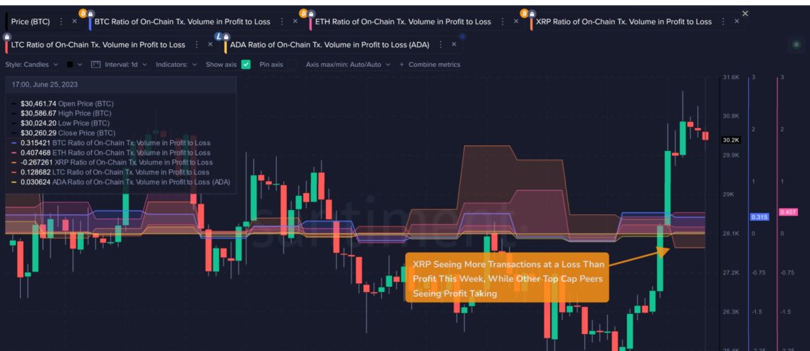 According to data from the on-chain analytics firm Santiment, XRP has differed from the rest of the top cryptocurrencies in terms of the loss-taking behavior of the investors. The relevant indicator here is the “ratio of on-chain transaction volume in profit to loss,” which, as its name already hints, tells us about how the profit-taking volume of a specific coin compares with the loss-taking volume.